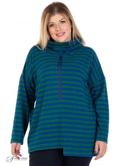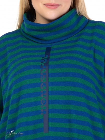Современный джемпер свободного силуэта выполнен из мягкого трикотажного полотна с рисунком в полоску. Модель с удлиненной линией плеча и воротником - «гольф». Рукав длинный, суженный к низу. Полочка декорирована вертикальной принтованной надписью. При изготовлении принта используется специальный пластификатор, который позволяет рисунку выдерживать длительную эксплуатацию изделия. Модель с асимметричной линией низа: правая сторона полочки укорочена относительно остальных деталей. Такой крой отлично маскирует проблемные зоны, стройнит фигуру и дарит ощущение свободы и комфорта.