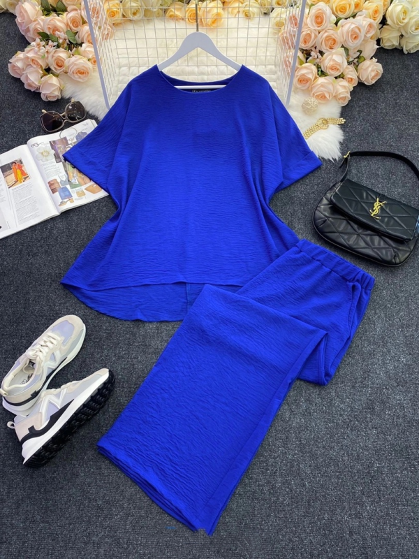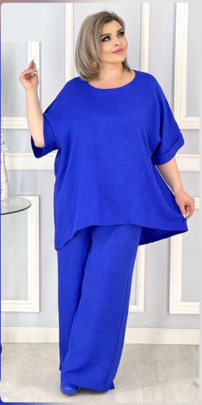 Элегантный, свободный, летний костюм выполнен из ткани сингапур. Ткань легкая, тонкая, но не рыхлая, с эффектом жатости, умеренно эластичная ( в составе есть небольшое содержание хлопка).