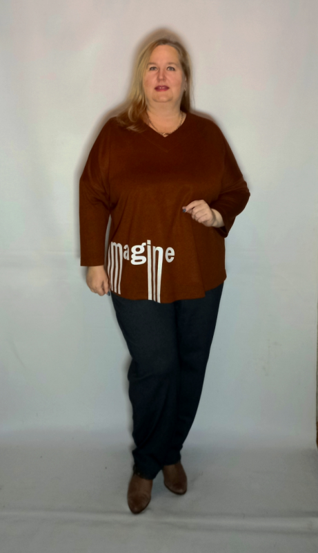 Демисезонная коричневая блуза с принтом свободного кроя выполнена из мягкого дышащего трикотажа.