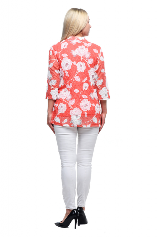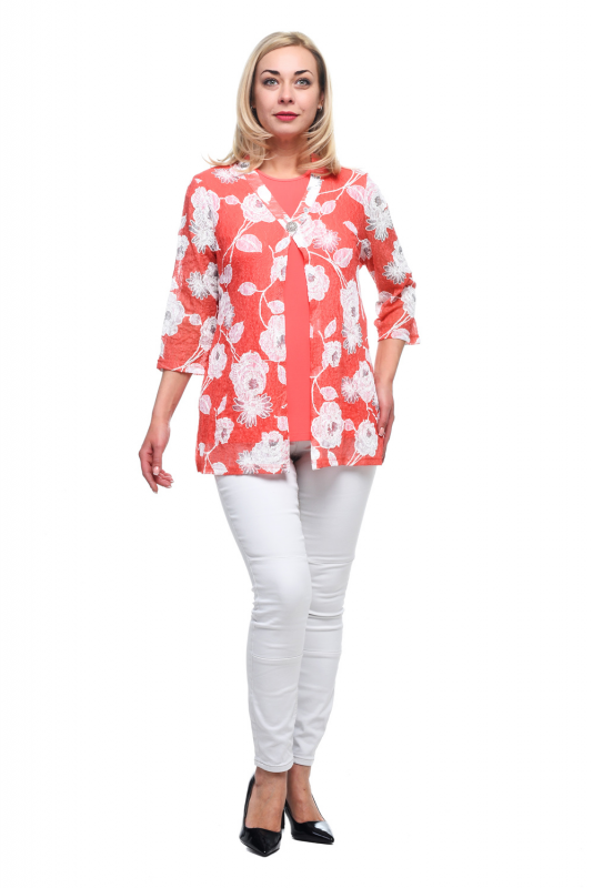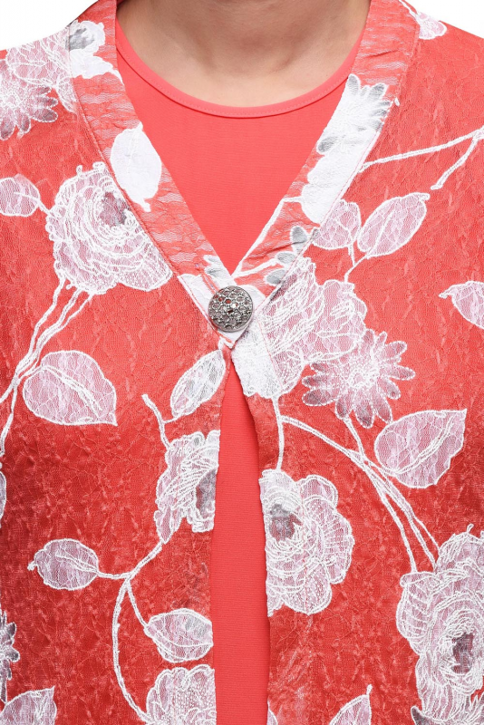 Эффектный стильный кардиган из кружевного полотна с крупным цветочным принтом в комплекте с топом. Модель с втачными широкими рукавами длиной 3/4; конусного силуэта, с V-образным вырезом, застегивается сверху на большую декоративную пуговицу.