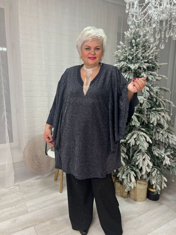 Шикарная, нарядная туника выполнена из трикотажа люрекс. Трикотаж средней плотнотси, люрекс - нит, а не напыление, поэтому не осыпается, эластмчный, внутри гладкий, приятный к тей. СНаружи слегка "шершавый", но не колкий. Подклад из прозрачной эластичной сетки. Туника не просвечивает!