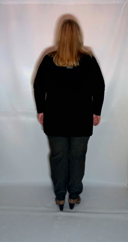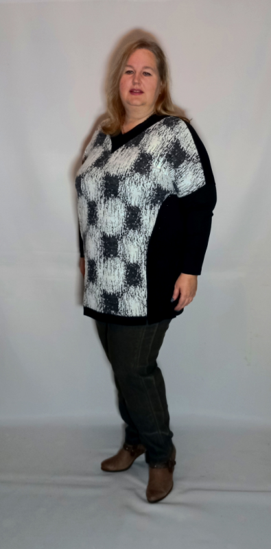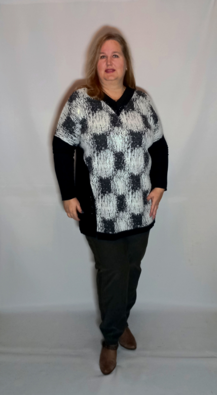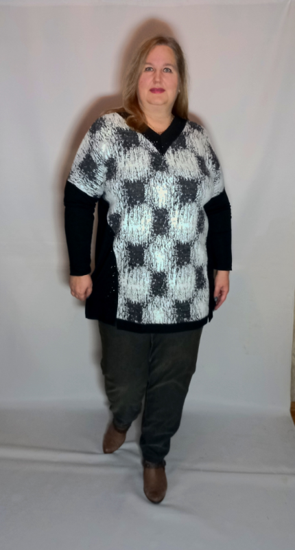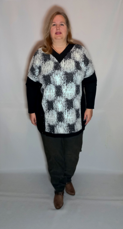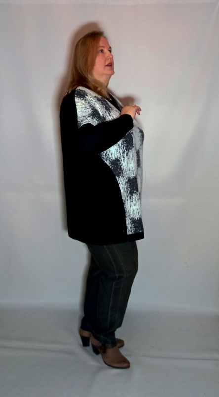 Полочка сложнокроенная: боковые вставки черного цвета, декорированы черными термостразами. Средняя часть полочки из  трикотажа "альпака"