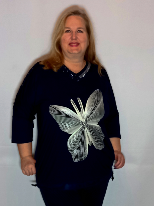 Вырез горловины V - образный, декорирован синими и серебристыми стразами.